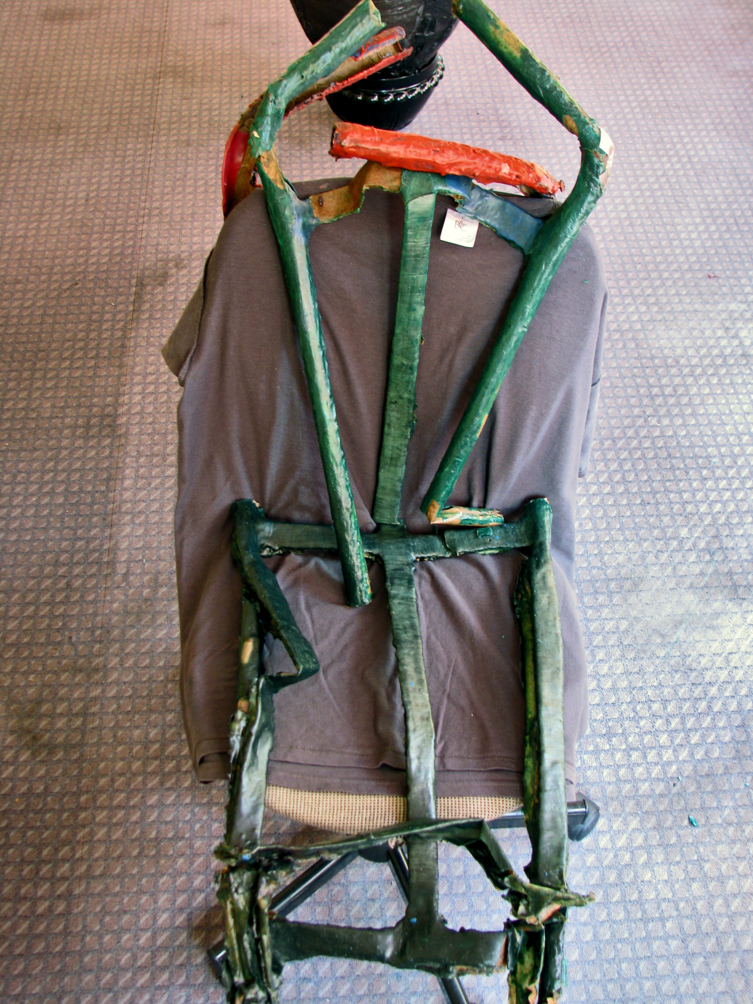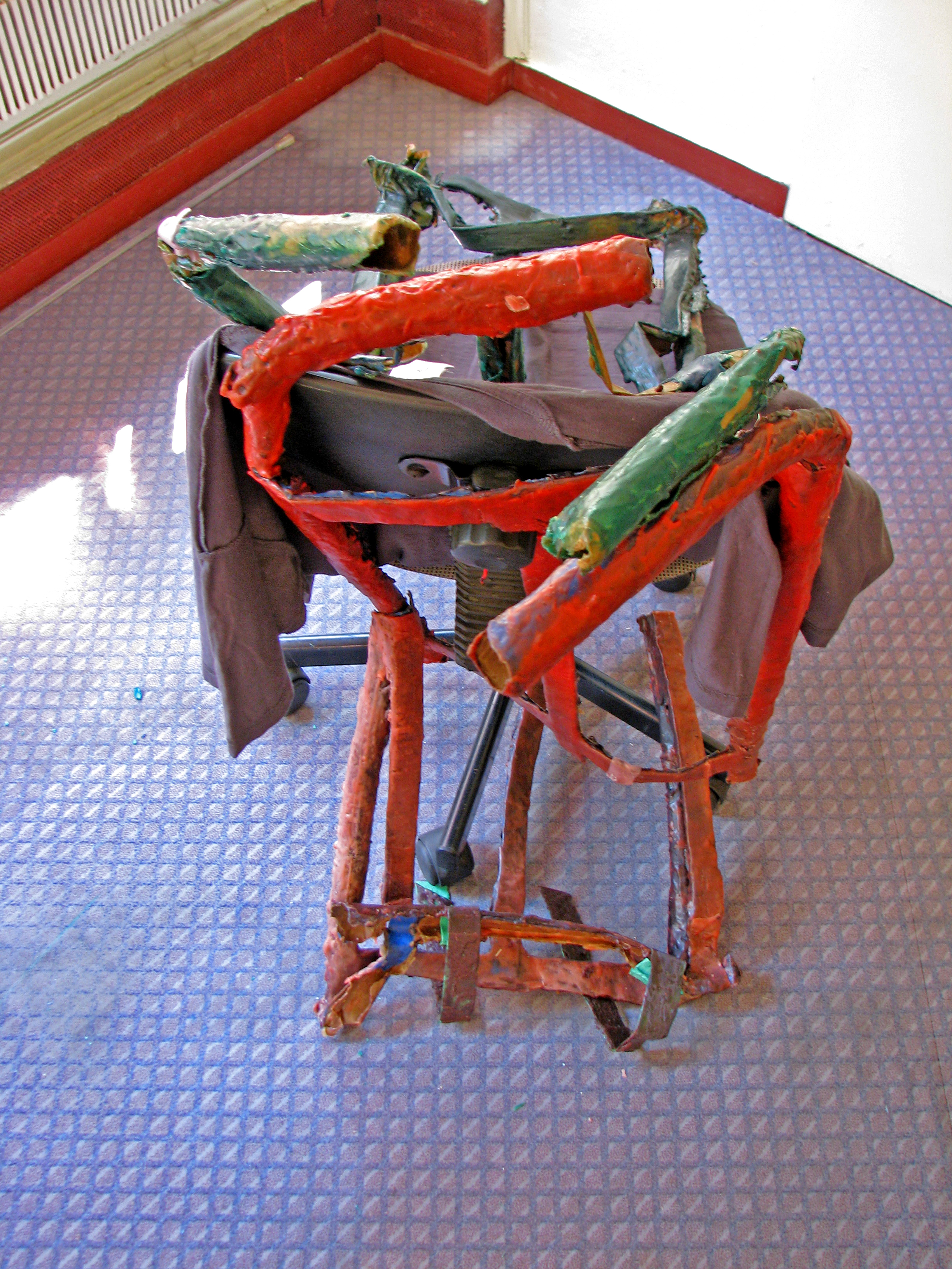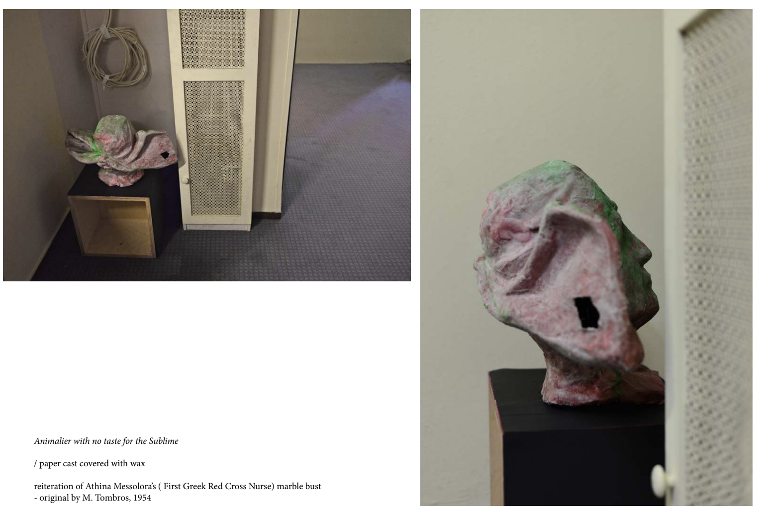 The 19th century term 'animalier' refers to sculptors who specialized in the representation of animals. A paper cast out of a clay mold after the marble bust of the firs Red Cross nurse (Athena Mesolora) is facing the corner of the wall. The back of the head has the tips of the headscarf extended. The headscarf is a reminder of antiseptic practices. From behind the figure has the ears of a dumbo, resembles an animal.