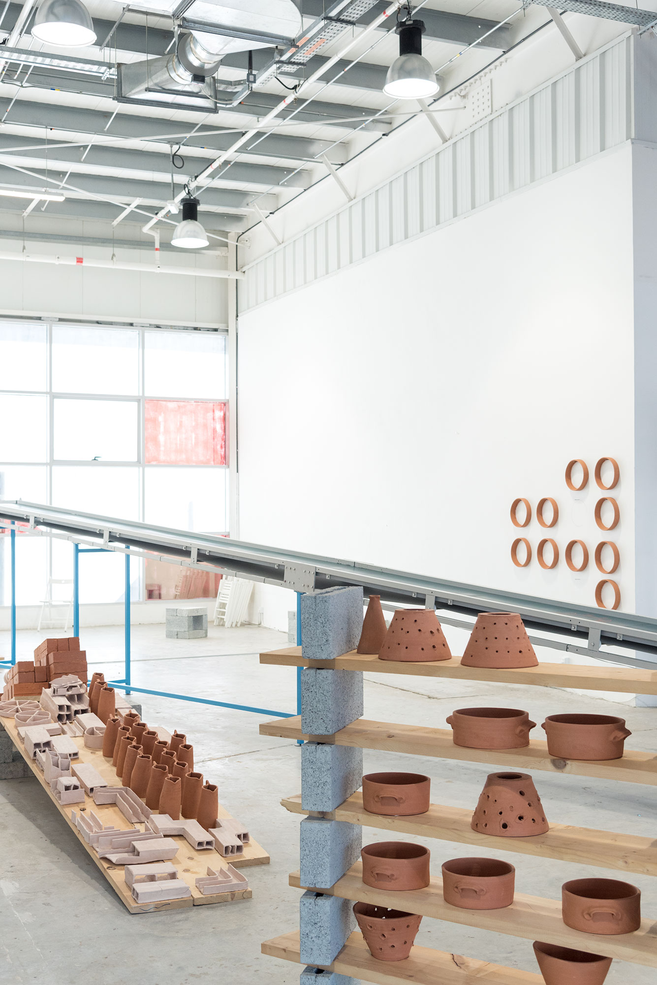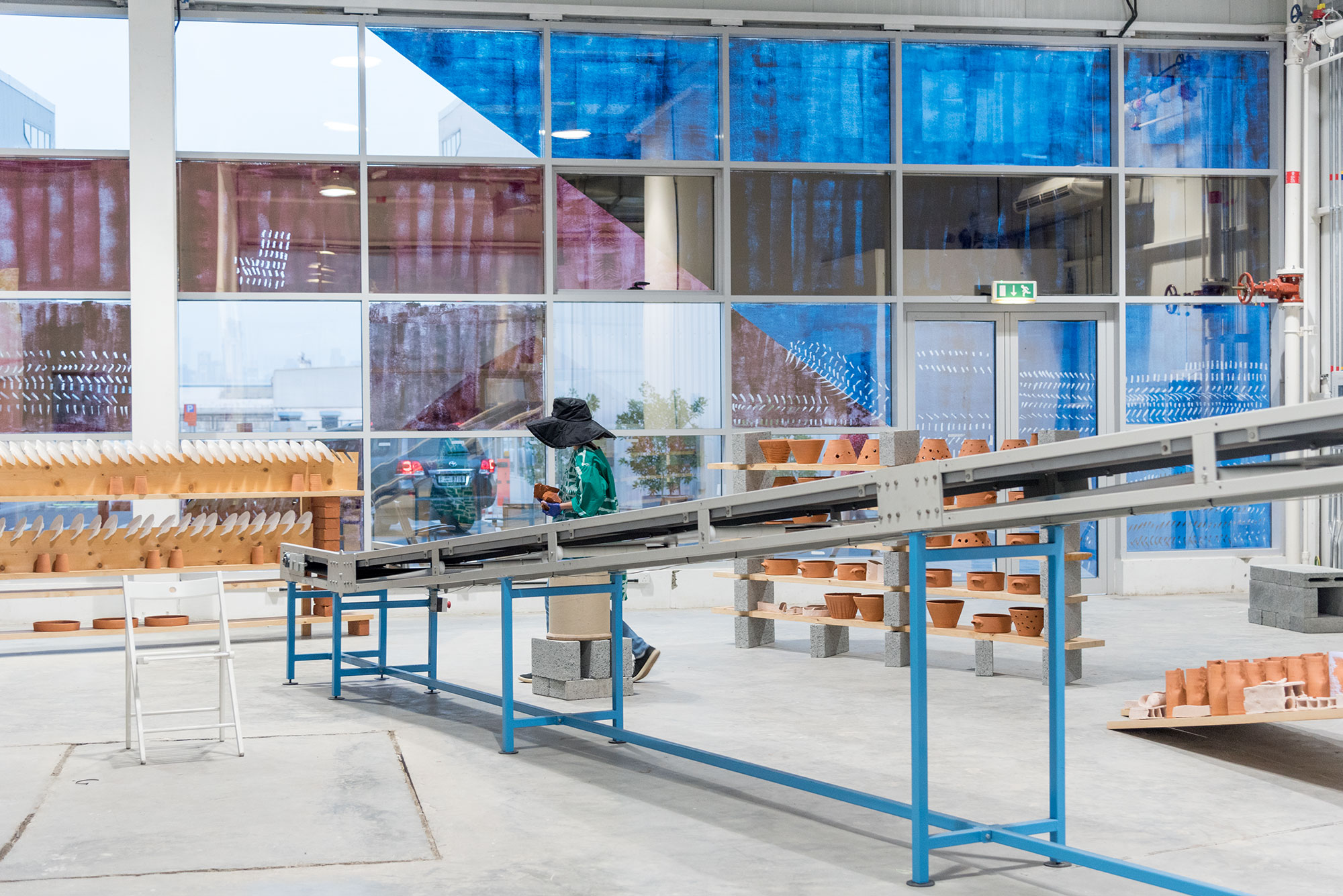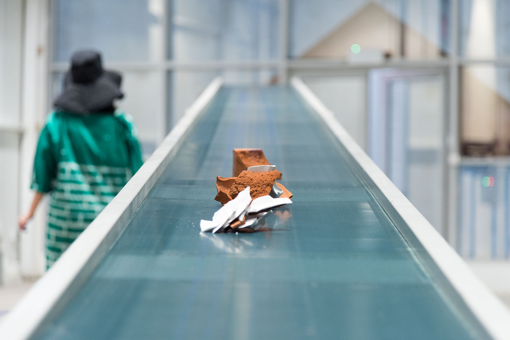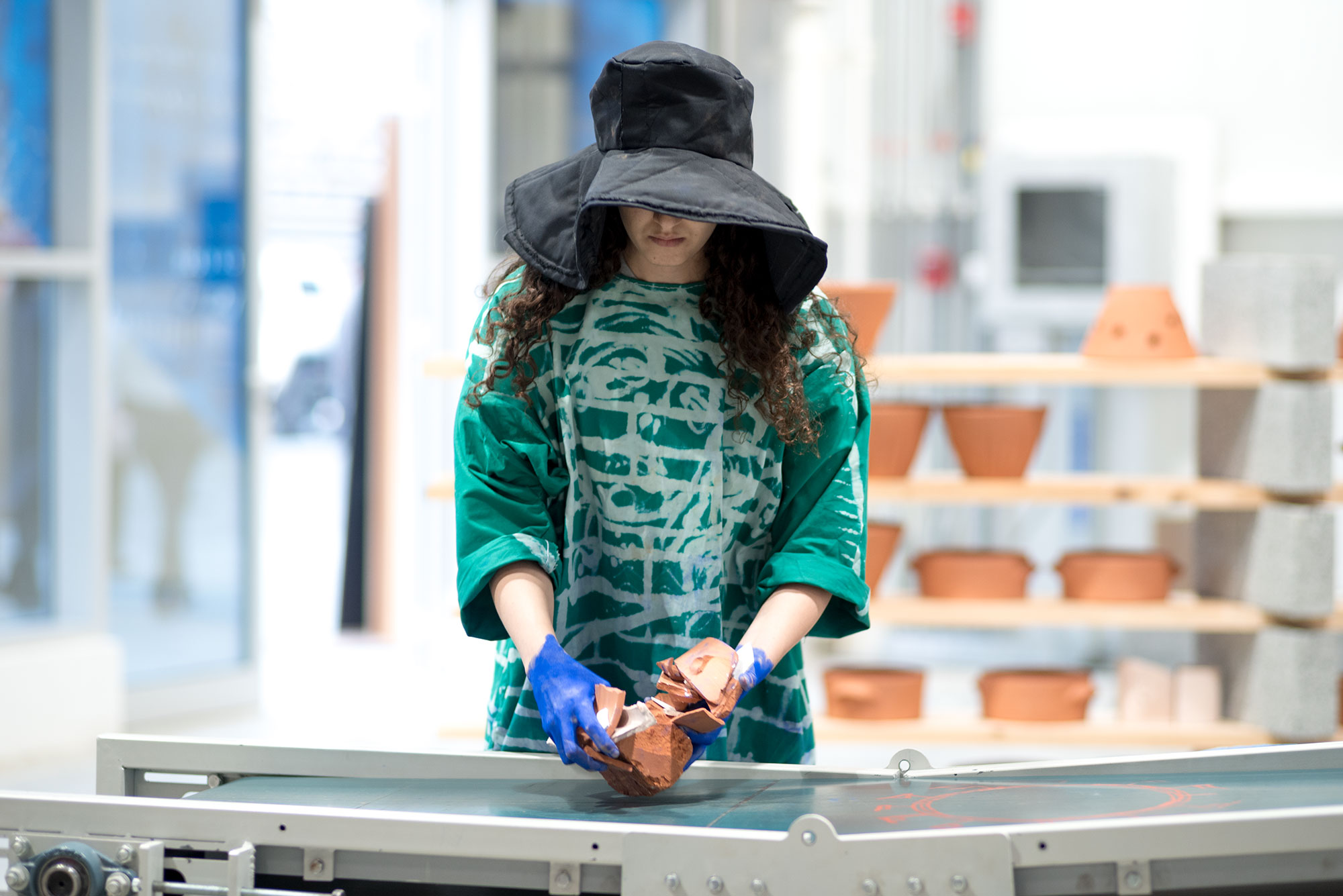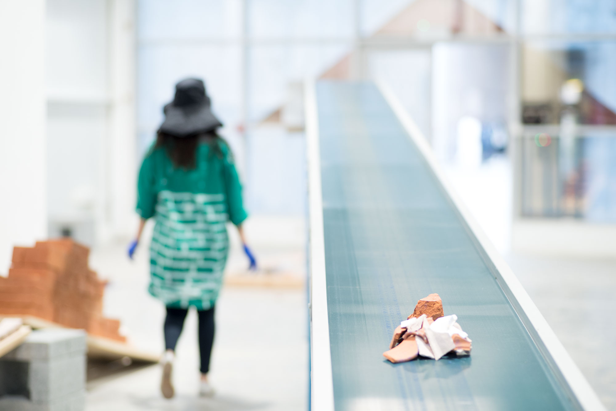 Fired ceramic and plaster items (clay bricks, wheeled turned canisters and plaster plates) are loaded to an operating conveyor belt by an operator. Items travel on the conveyor belt up to 2 meters high and then are left to a free fall at the end of the belt. Shards and remaining pieces are reloaded by the loop operator. Operation is repeated. Gradually a pile is formed on the side. https://www.youtube.com/watch?v=wKFLWv3u654