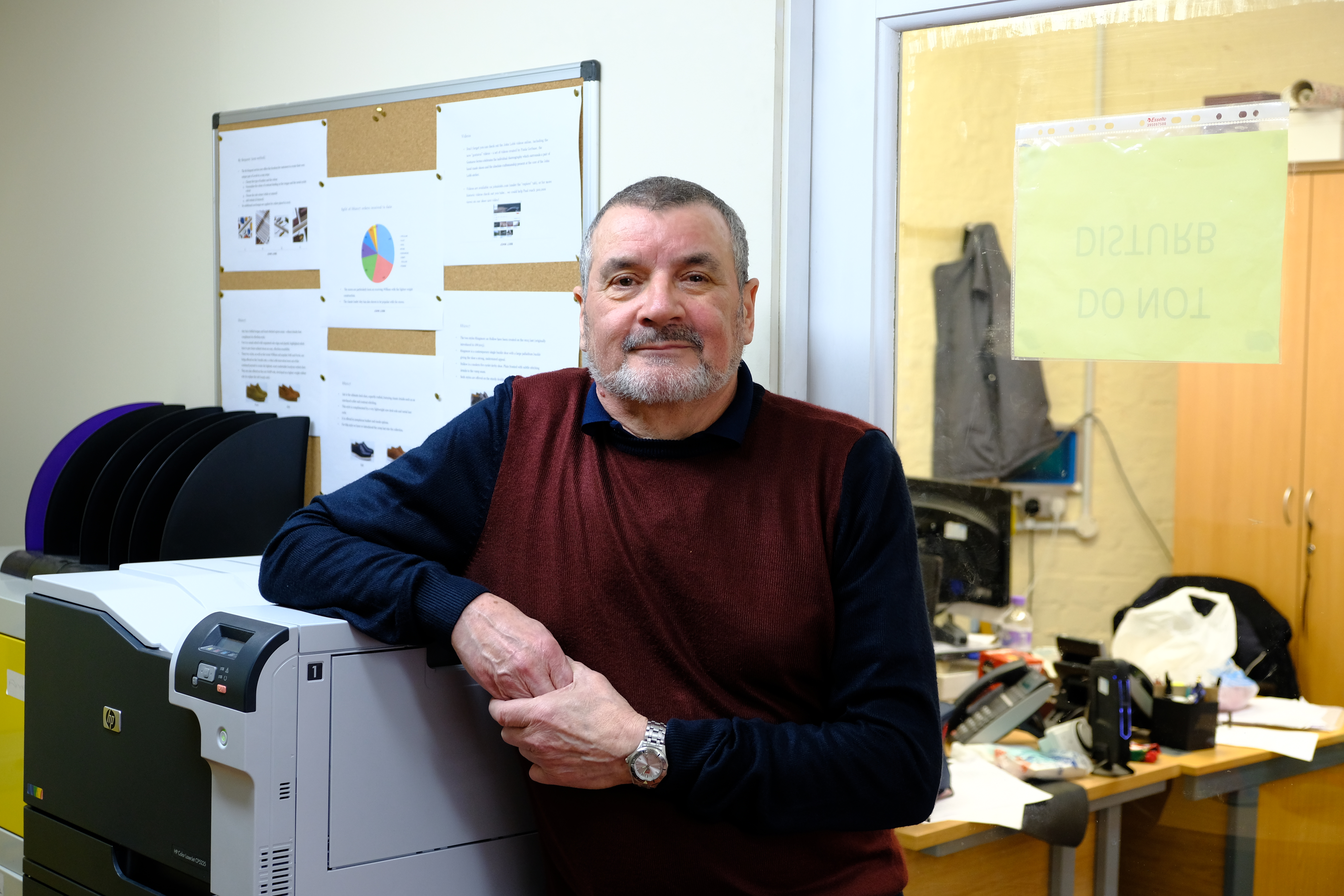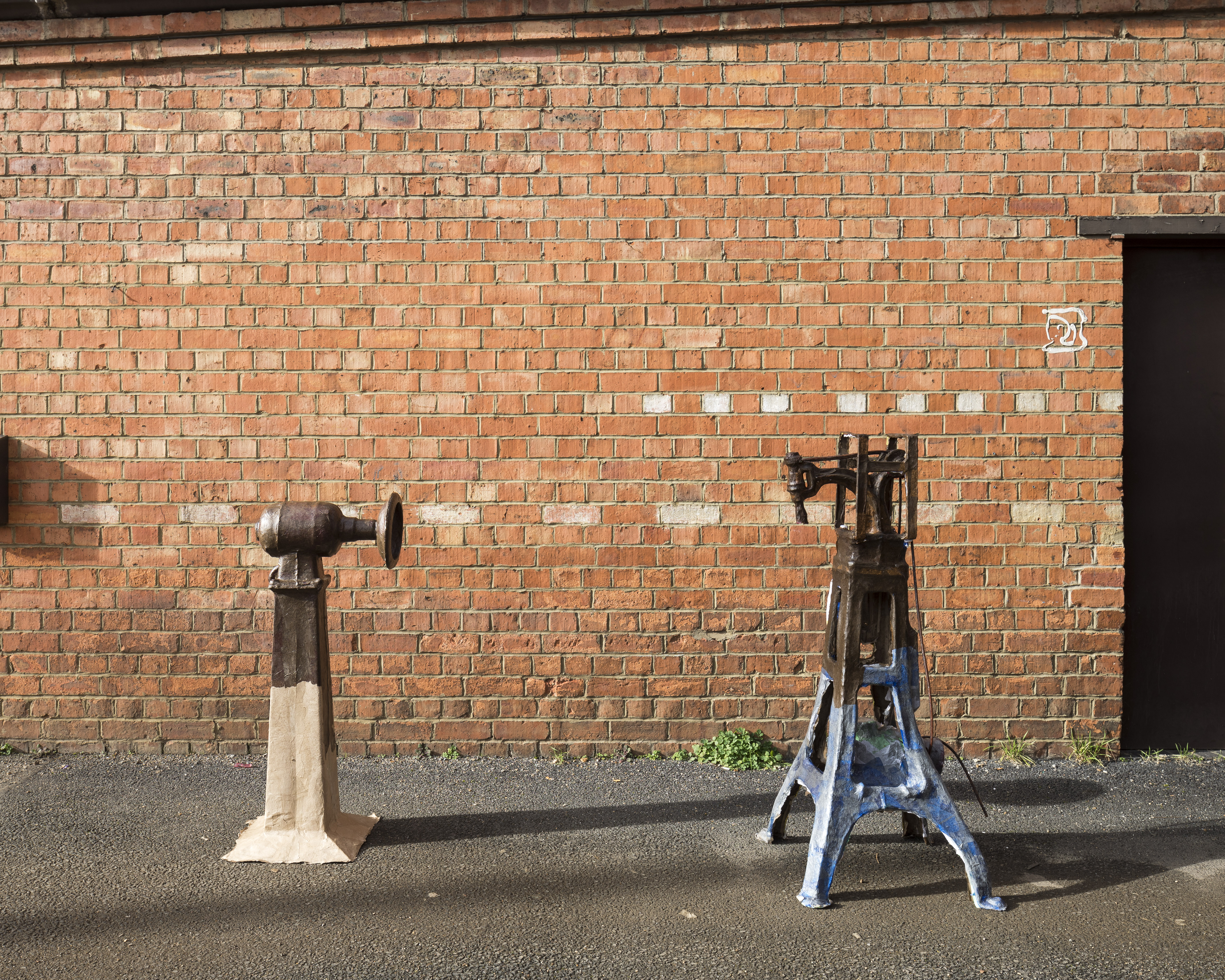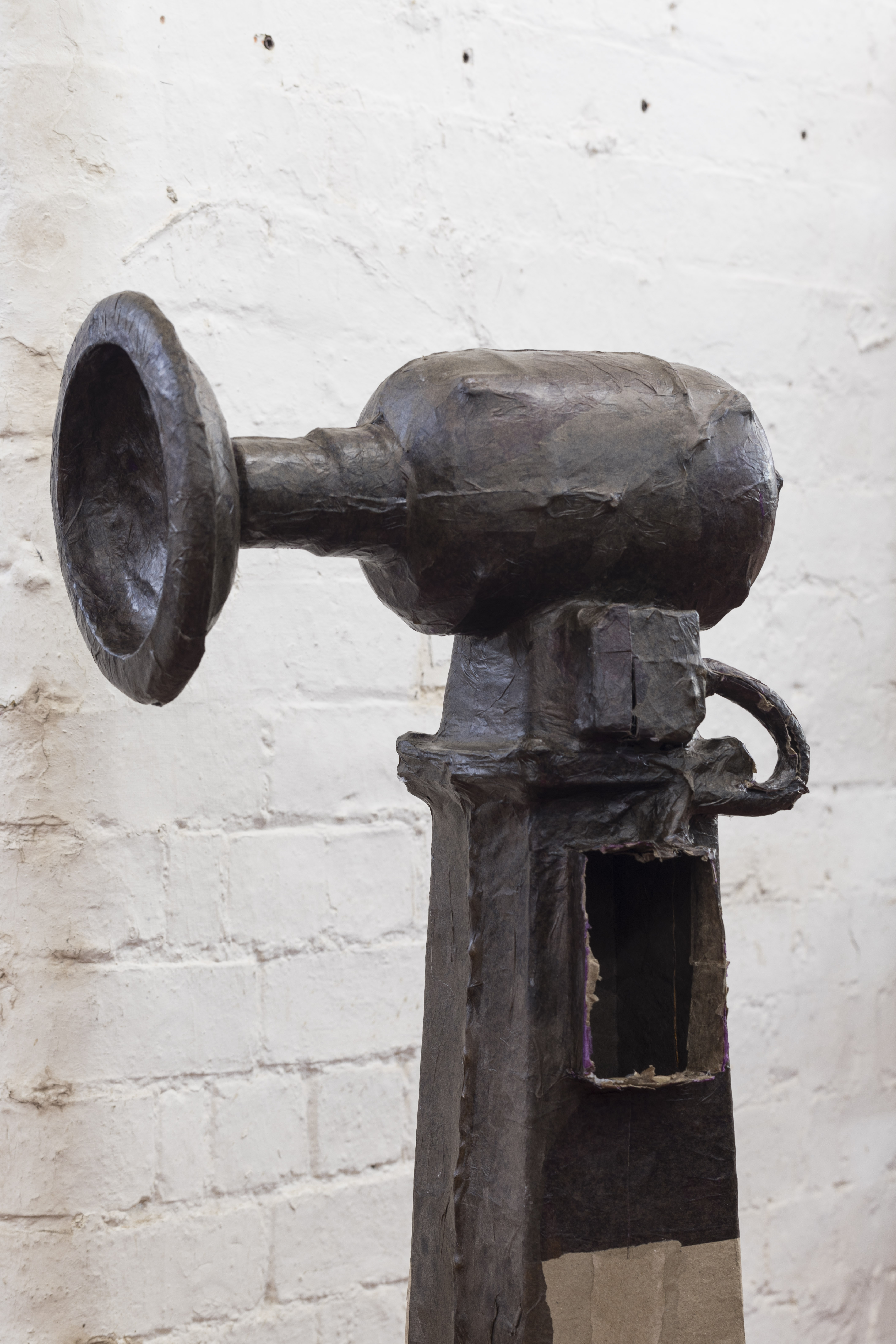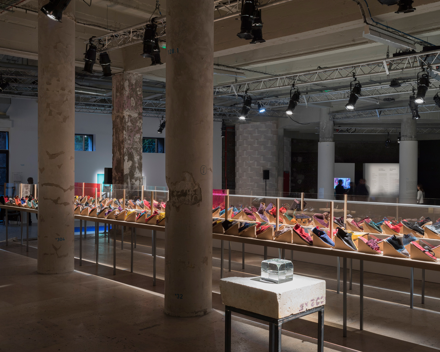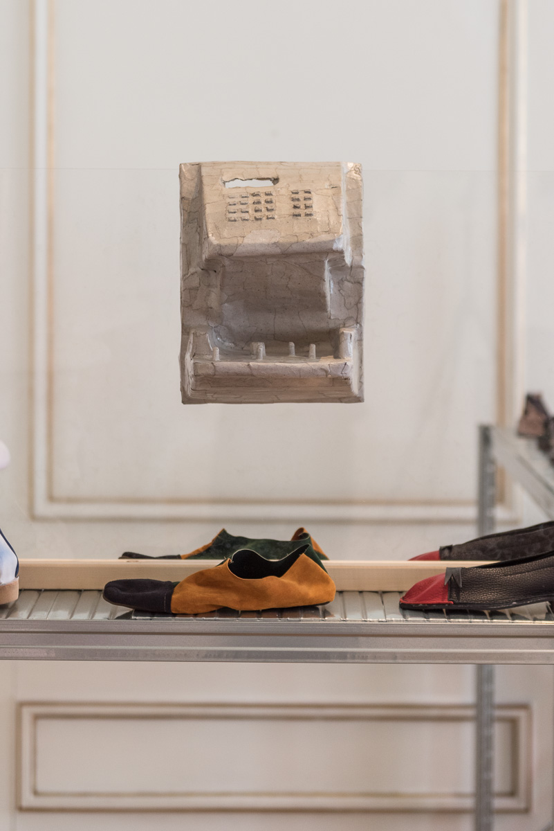 A collective portrait in leather, rubber, paper, latex, glue, plaster, MDF. And a cast of a biometric recognition system machine for employees, branded as Hand Punch 3000.