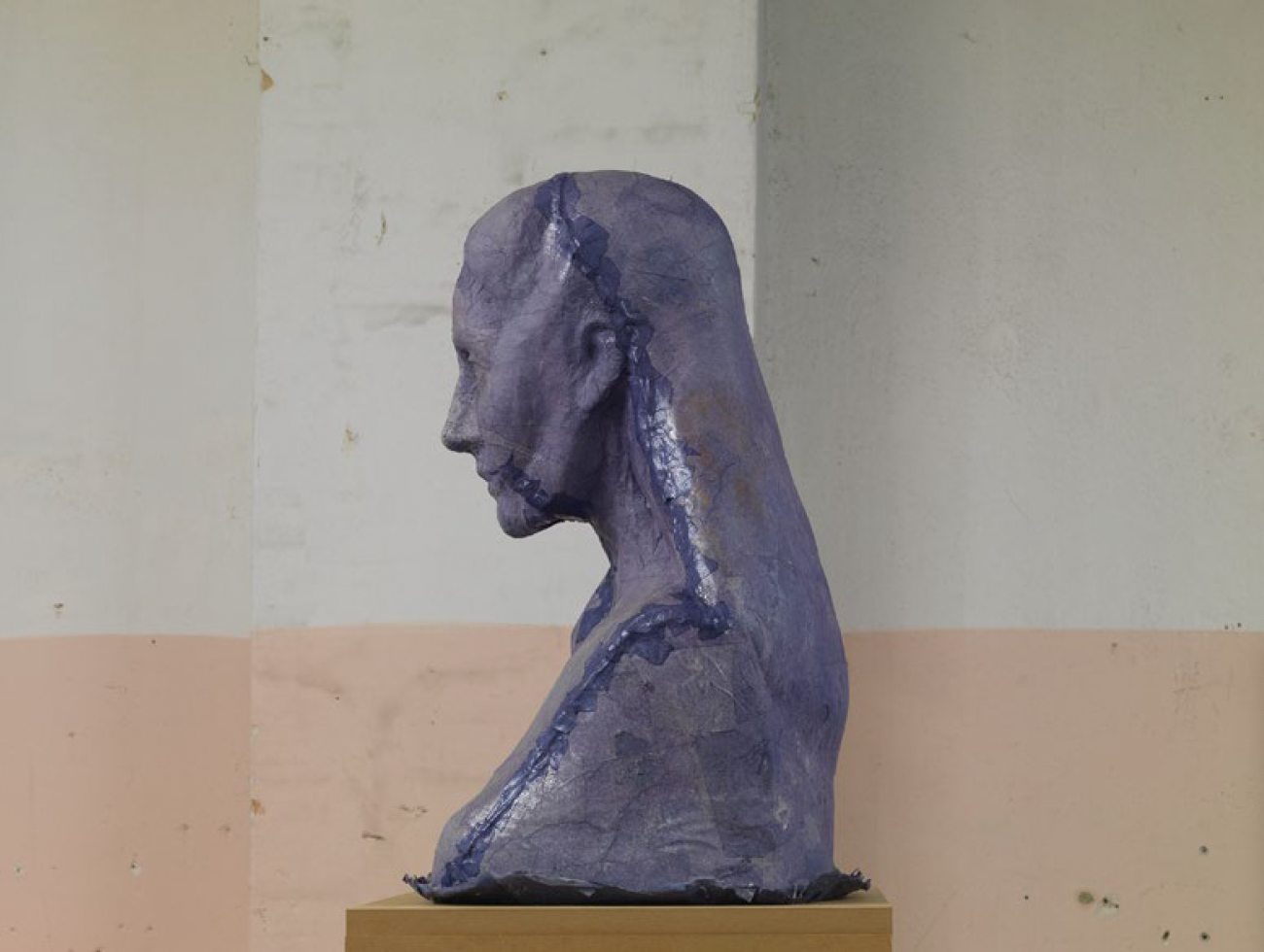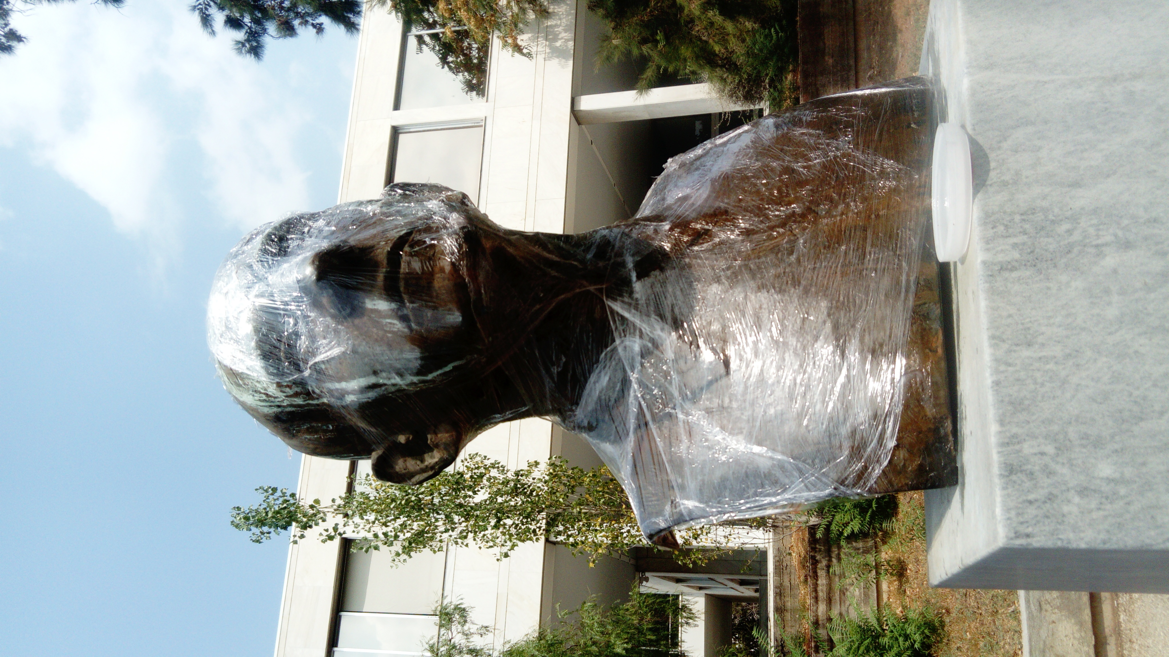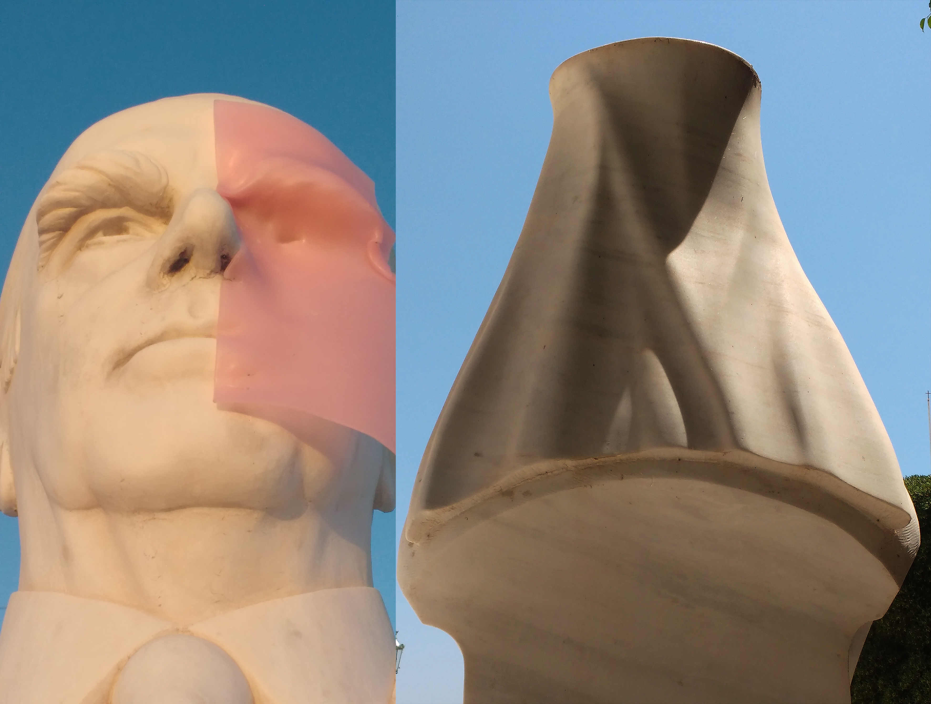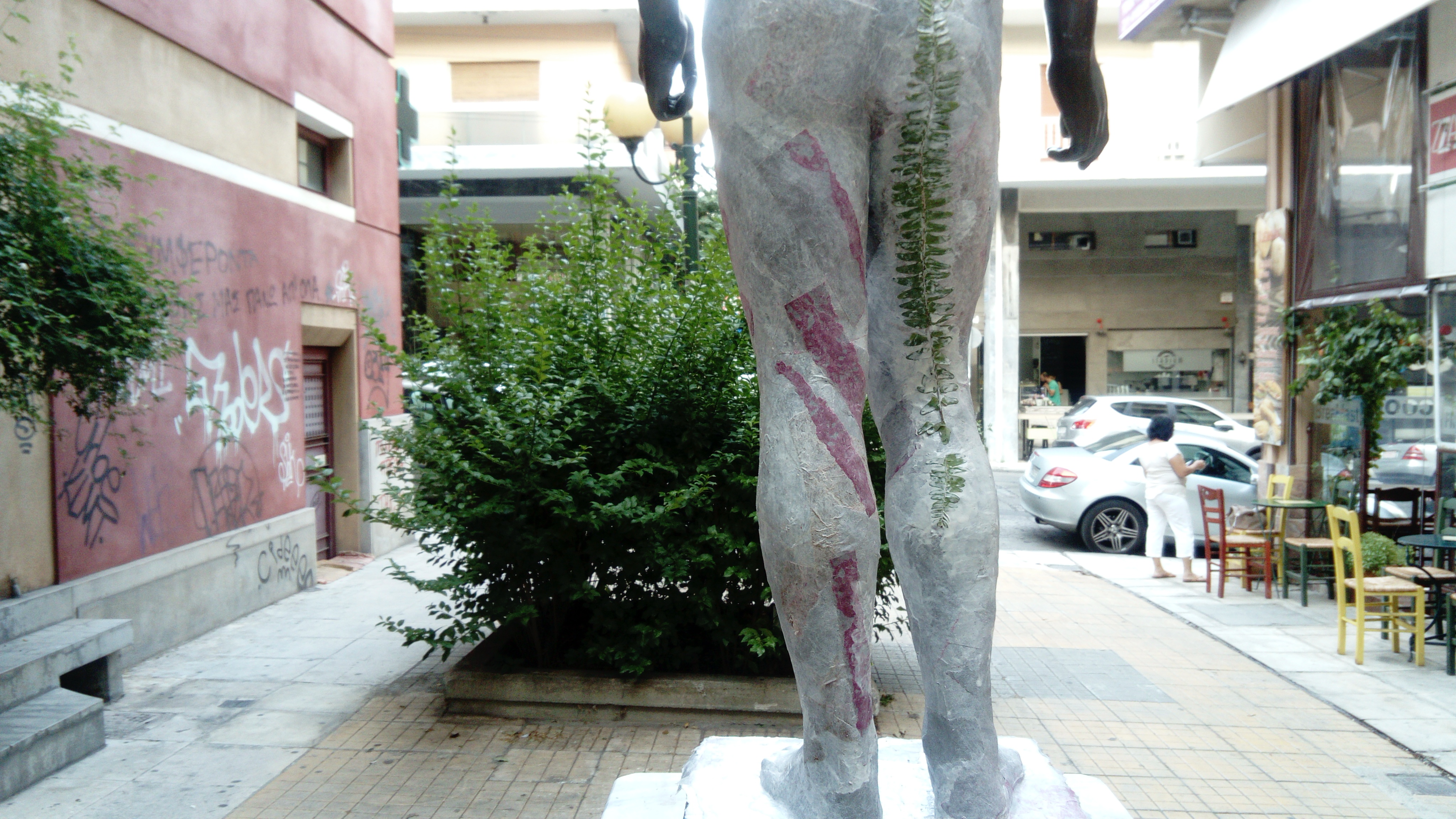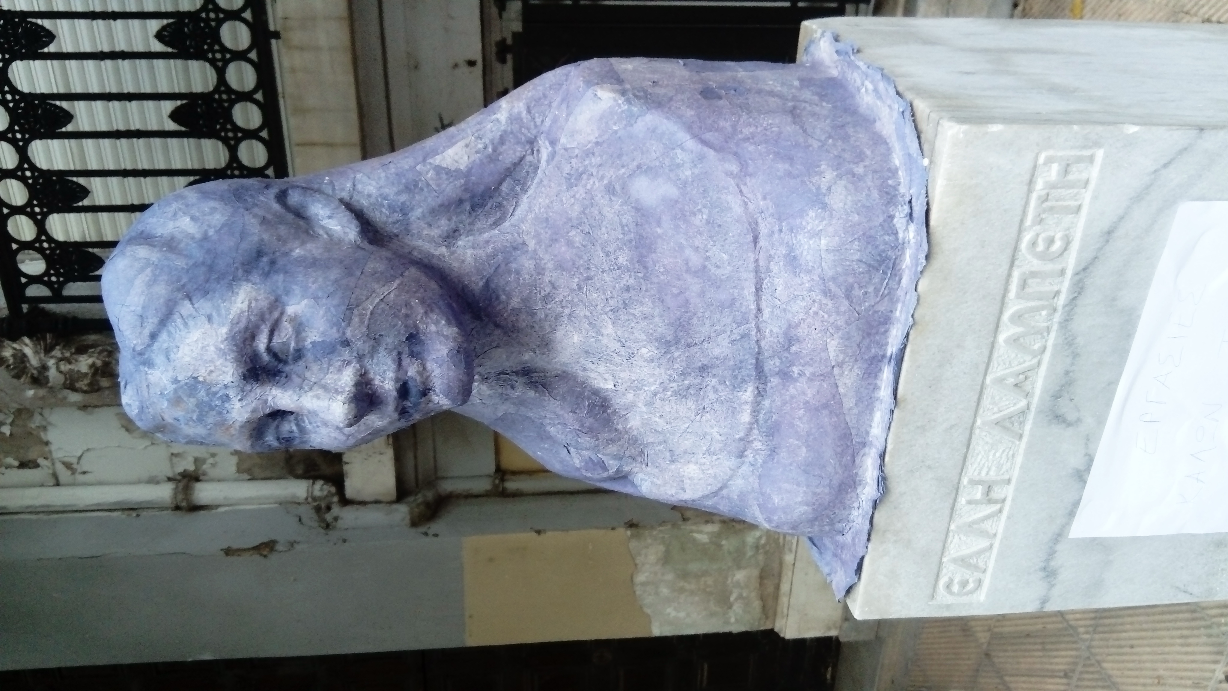 I make the casts only when circumstances allow me to take time and space to work directly onthem, on site. These figures belong to different historical times and some constitute a symbol (mythological, popular or nationalistic) of their own category. Some are well maintained, others becomedirty through time. They mostly remain unseen, but are real landmarks of the Athens landscape. Some are made by gifted sculptors, others feel funny to look at, maybe because of their awkward placement. I like to cast them in color papers. The originals are brought from the outside inside a room, turning stone, marble and bronze into a thin skin of paper and glue. These paper shells are here virtually free of weight. I see in the cast the plain nature of the original.”